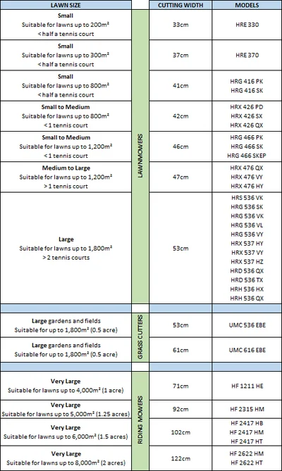 To help you find the Honda mower for your lawn size, please use the table below as a guide: